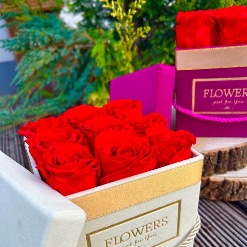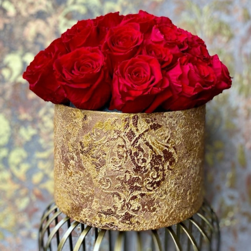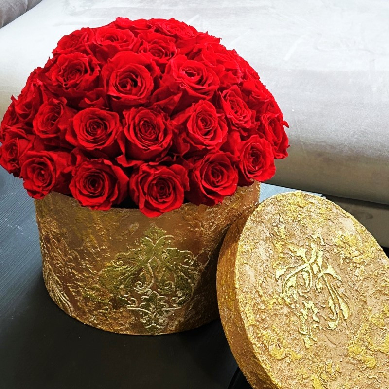 Stabilizované ruže v luxusnom boxe metalického vzhľadu - zlatý
